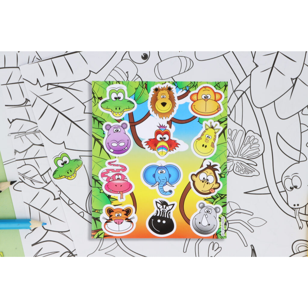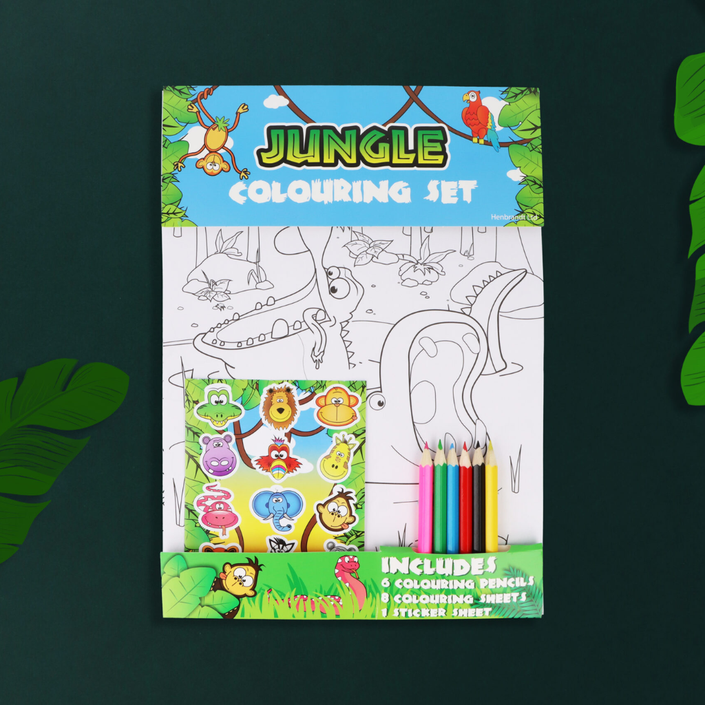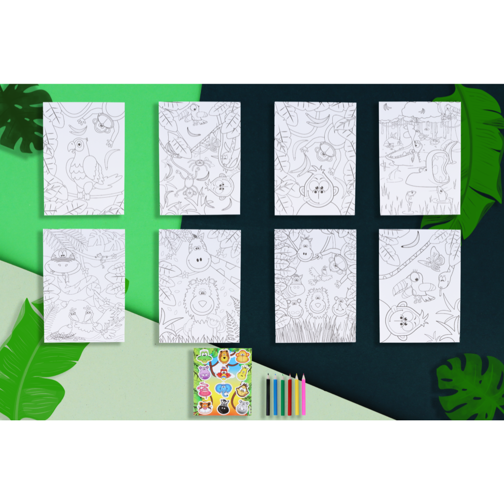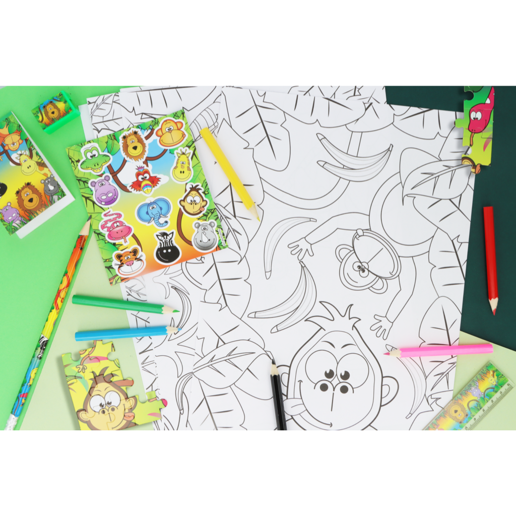 This fantastic colouring set includes 8 Jungle Animal colouring sheets, 6 mini colouring pencils, and 1 sticker sheet. They are perfect party activities and classroom fun. Size: A4 / 21cm x 30cm.