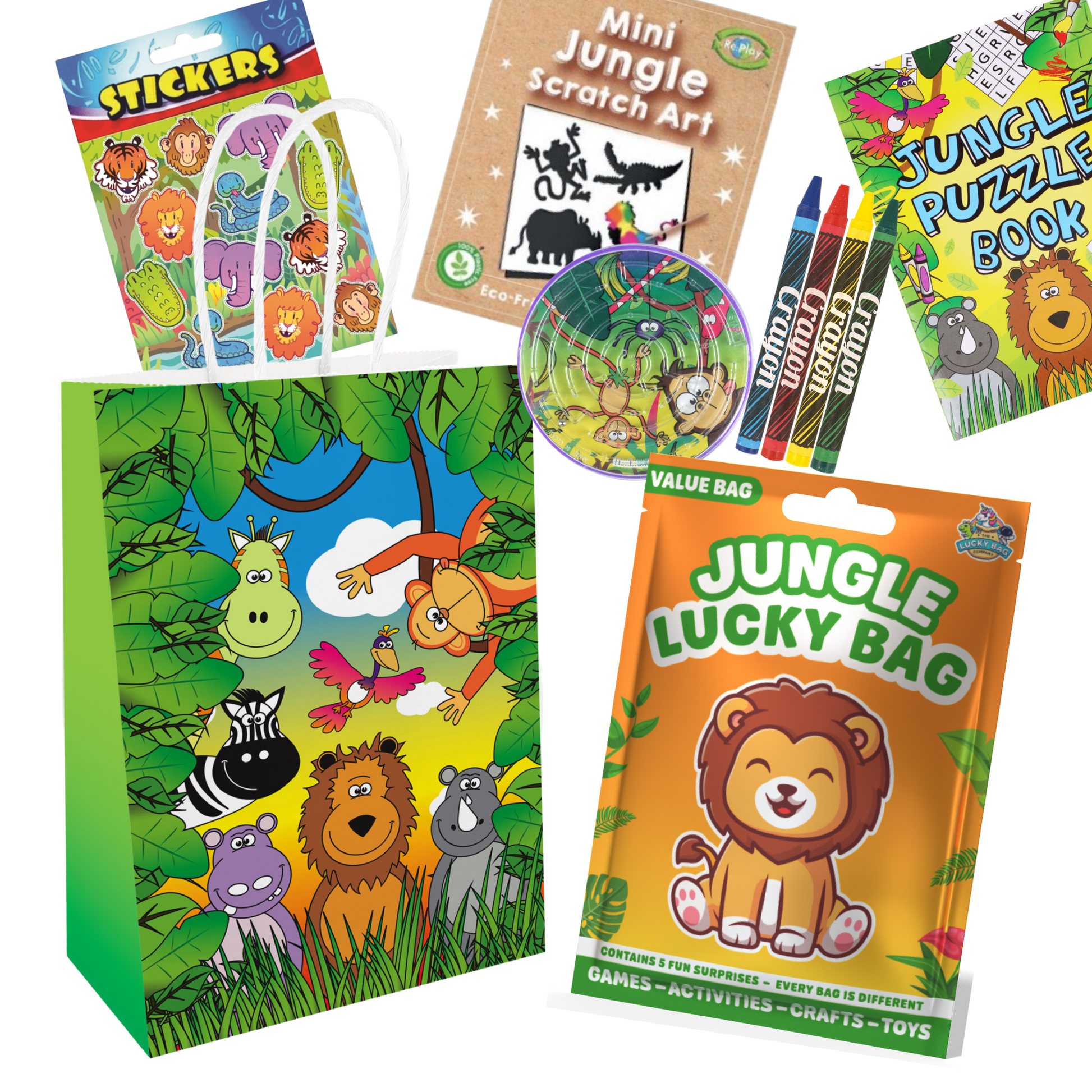 - One Jungle Themed Value bag, containing 5 space themed toys and activities with crayons + a free activity sheet