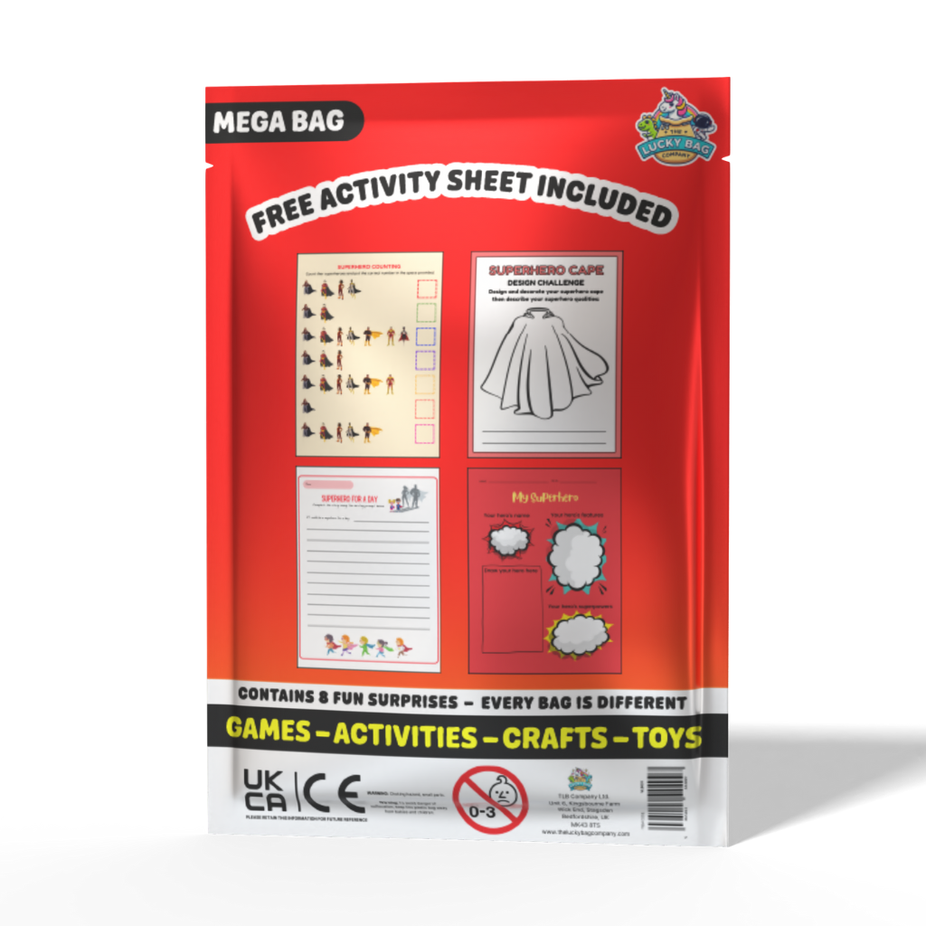 - 8 Superhero themed surprises including crayons. (e.g. Puzzle Book, craft kits, bouncy balls and more...)
